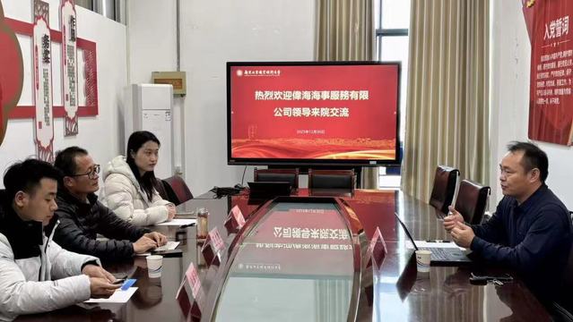12月30日下午,伟海海事服务有限公司总经理高景龙一行来访云顶集团交通工程学院,双方在工业中心G4-406会议室交流座谈。交通工程学院党委副书记、院长王文凯,院团委书记周嵘,就业辅导员李贵飞参与交流。