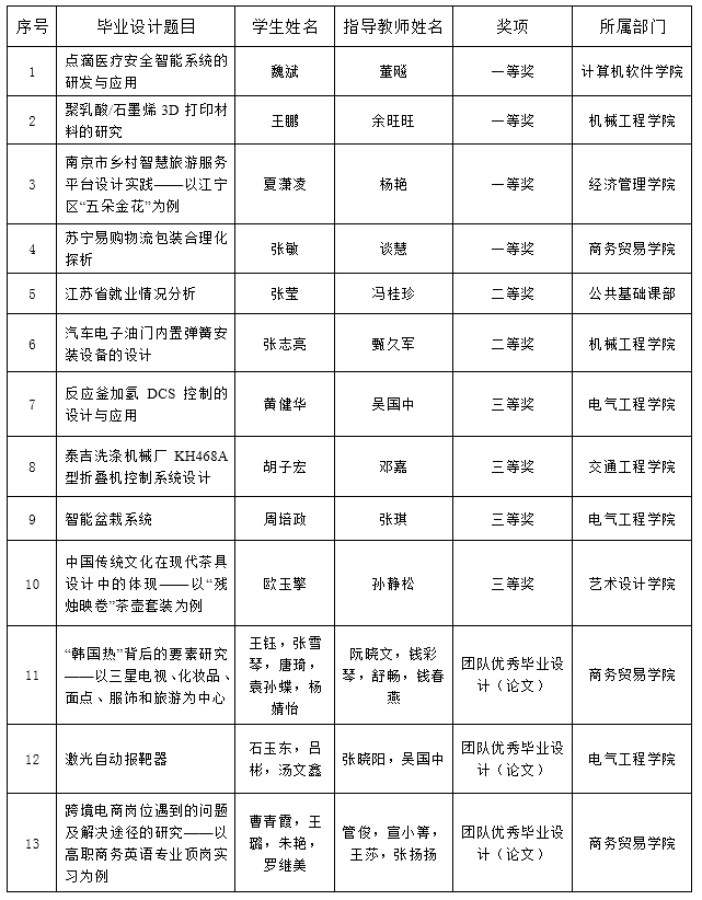 近期获悉,根据《省教育厅办公室关于做好2016年普通高校本专科毕业设计(论文)评优与抽检工作的通知》(苏教办高〔2016〕7号)要求,学校创新毕业设计省级推优办法,在学校推荐的基础上,经专家评审、结果公示和省教育厅审定等程序,云顶集团所推荐参加普通高校本专科毕业设计(论文)省级评选的十三篇论文(个人申报10项,团体申报3项),获得个人一等奖4项,二等奖2项,三等奖4项,团体奖三项,获奖率100%,成为一等奖获奖量和获奖总数最多的高职院校,名列全省首位,创学校历史新高。